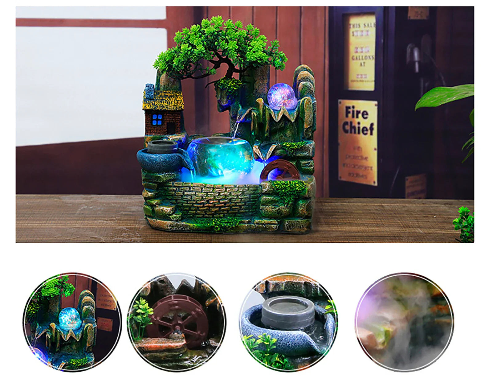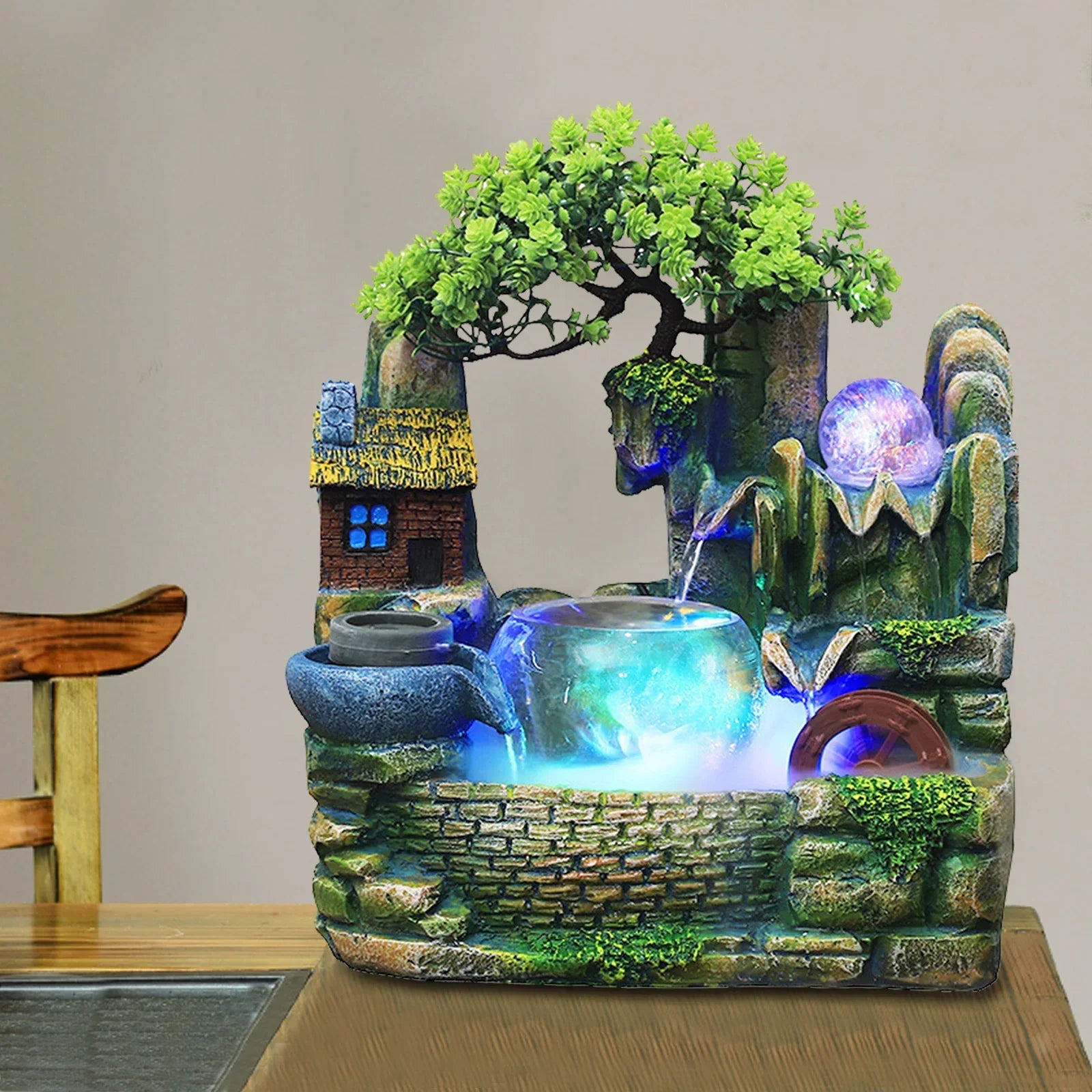 Fontanna LED z wodospadem, dekoracja biurkowa